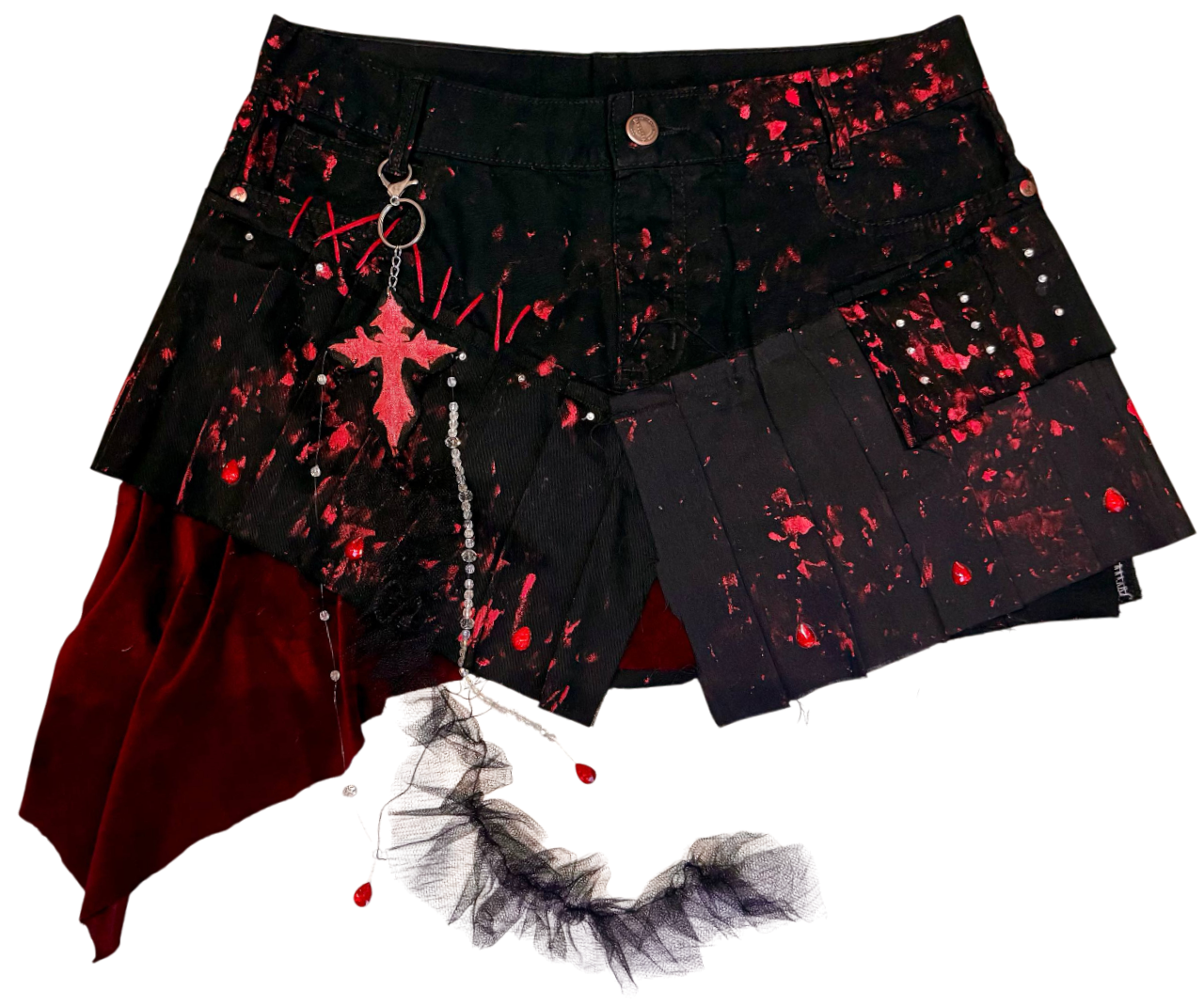 Entre respingos e rasgos, pequenas pedrinhas coladas e pingentes de cristal emergem como fragmentos de luz no meio do sangue e do caos. Cada detalhe Ă© pensado para refletir contraste â o brilho que nasce da destruição, o belo que resiste no sombrio.